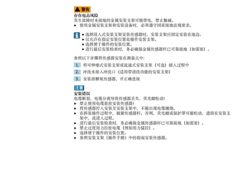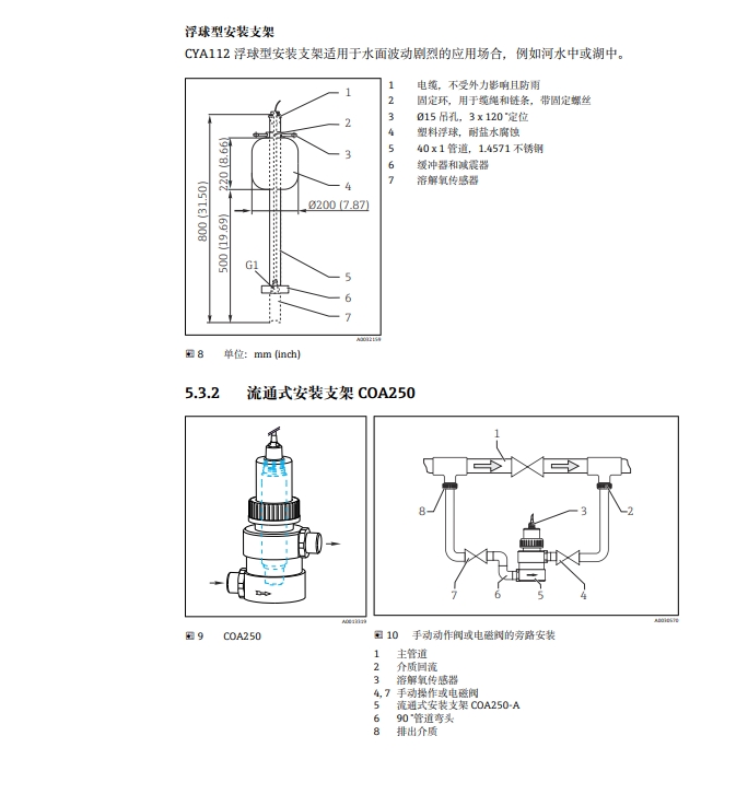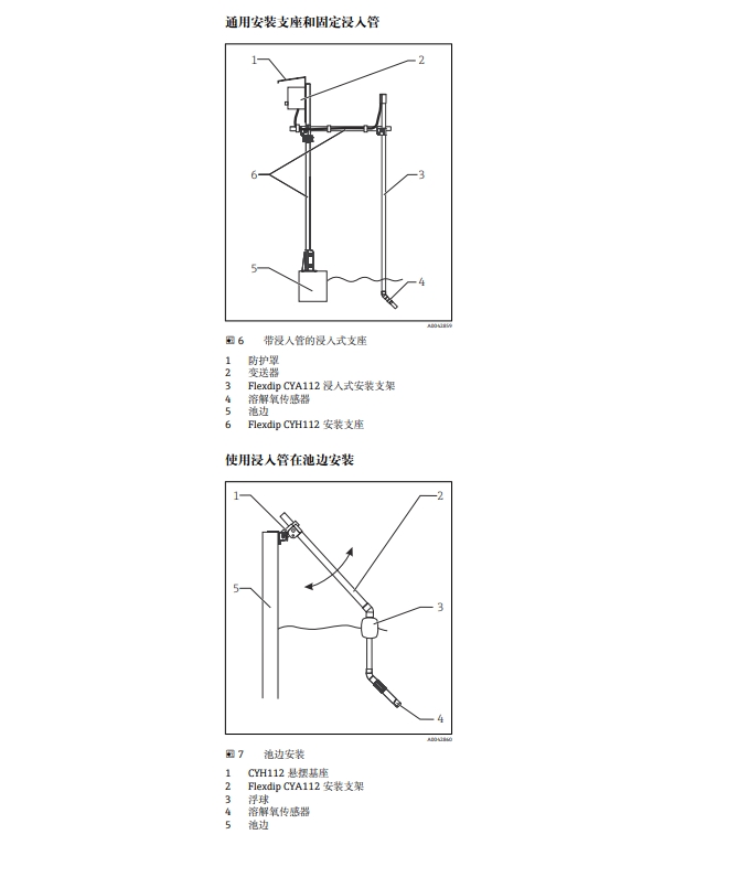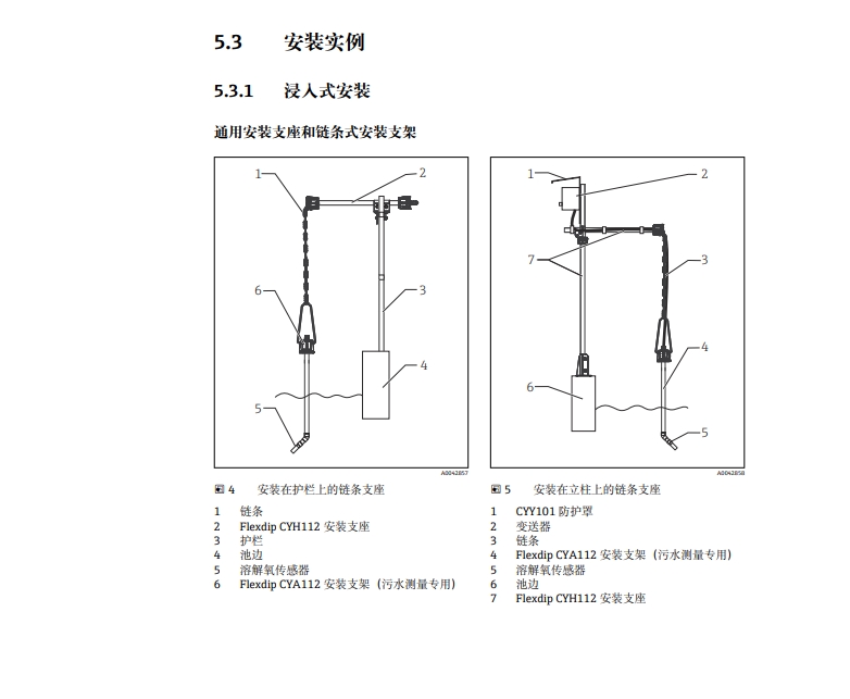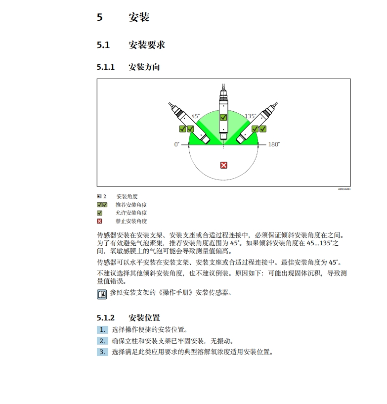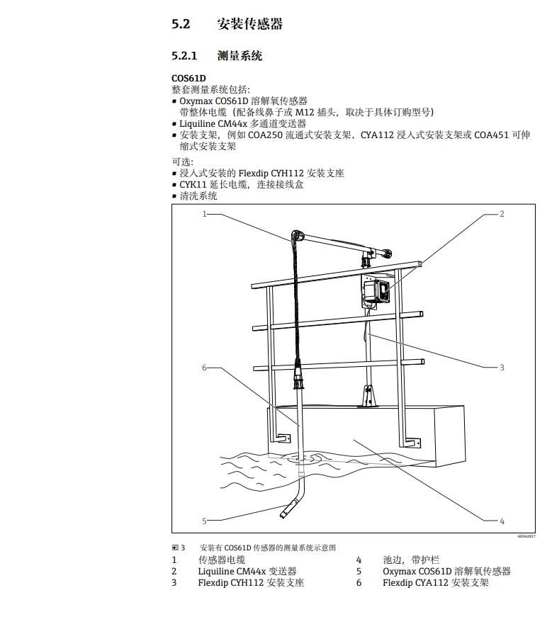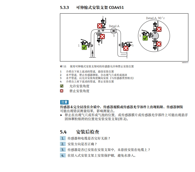 4.污水处理中使用的安装支架CYA611,箭头指向为介质流向。安装角度为45°(推荐安装角或90°如需了解更多关于COS61D的安装方法,建议查阅传感器使用说明书或咨询专业技术人员。