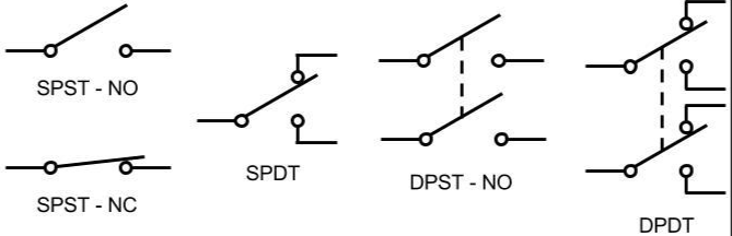 电路开关是负责开通电路的控制元件,有SPST(单刀单掷)、SPDT(单刀双掷)、DPST(双刀单掷)、DPDT(双刀双掷)。
