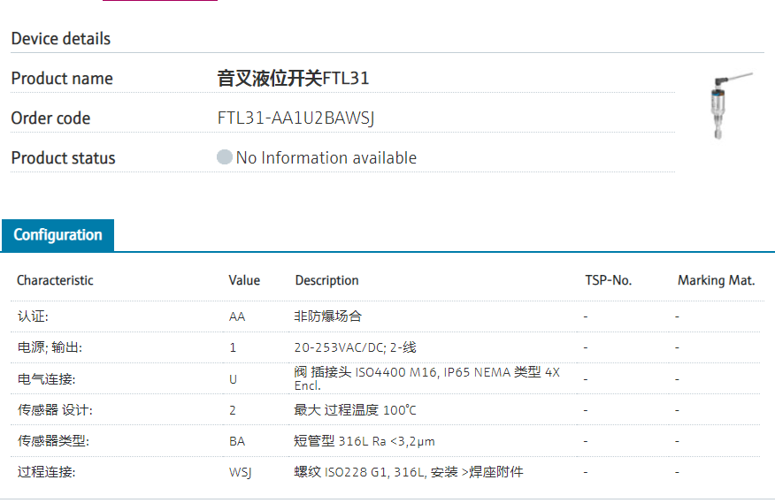 FTL31-AA1U2BAWSJ 订货号 FTL31-1779/0 扩展订货号 (FTL31-AA1U2BAWSJ) 名称 音叉液位开关FTL31 基本描述 点式物位仪 音叉震动式