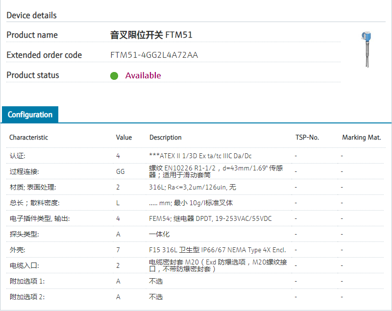 :: no maintenance needed认证: 4 ***ATEX II 1/3D Ex ta/tc IIIC Da/Dc 过程连接: GG 螺纹 EN10226 R1-1/2,d=43mm/1.69" 传感器;适用于滑动套筒 材质; 表面处理: 2 316L; Ra<=3,2um/126uin, 无 总长;散料密度: L ..... mm; 最小 10g/l标准叉体 电子插件类型, 输出: 4 FEM54; 继电器 DPDT, 19-253VAC/55VDC 探头类型: A 一体化 外壳: 7 F15 316L 卫生型 IP66/67 NEMA Type 4X Encl. 电缆入口: 2 电缆密封套 M20(Exd 防爆选项,M20螺纹接口,不带防爆密封套) 附加选项 1: A 不选 附加选项 2: A 不选