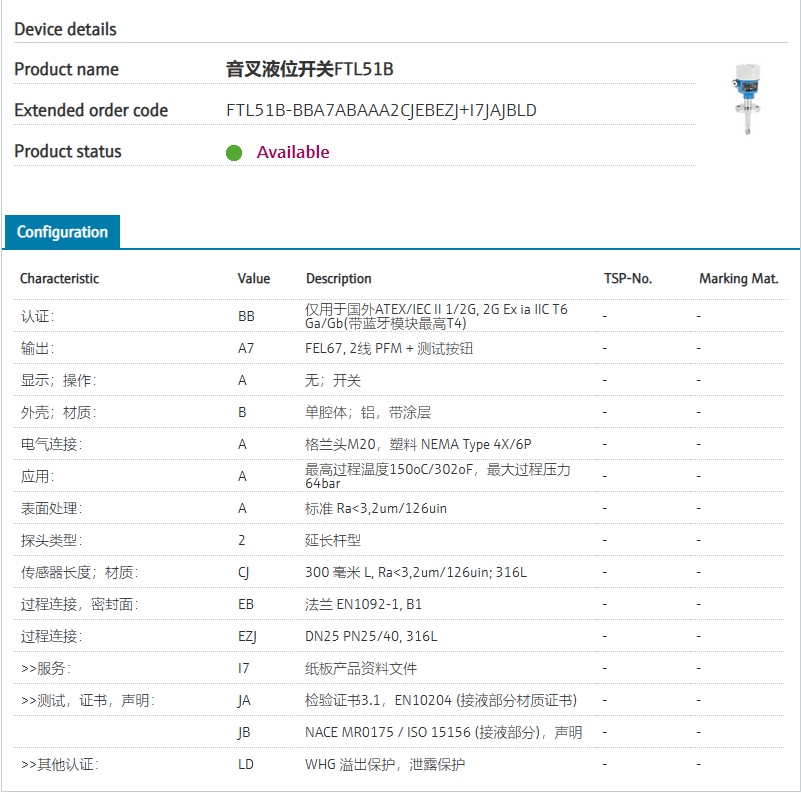 FTL51B-BBA7ABAAA2CJEBEZJI7JAJBLD 订货号 FTL51B-37913/0 扩展订货号 (FTL51B-BBA7ABAAA2CJEBEZJI7JAJBLD) 名称 音叉液位开关FTL51B 基本描述 Point level/density, vibronic.