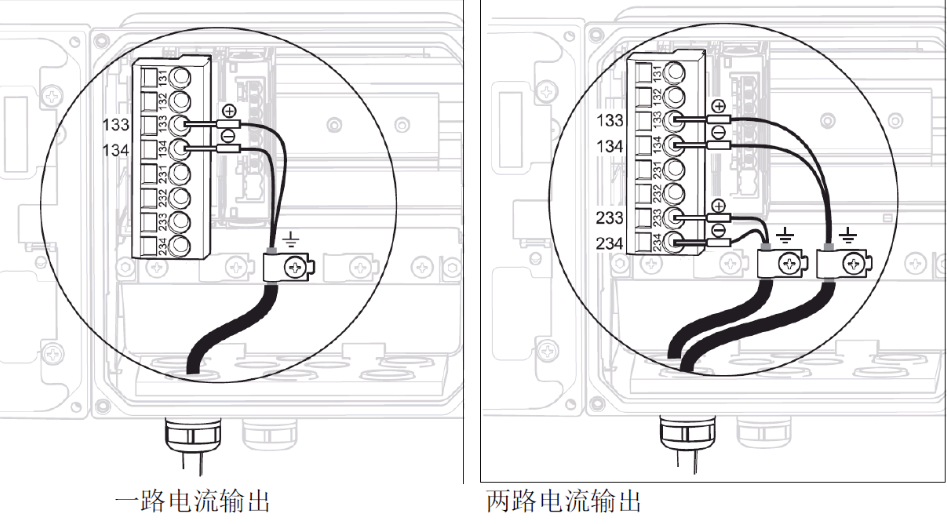 注: 供电电压容许范围是12.5 to 30 VDC 133接电压+,134接电压 - 。两路输出则233+,234 - 。
