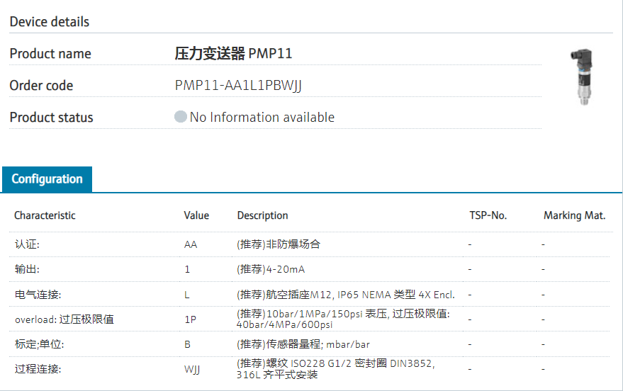 膜片: 316L, 焊接认证: AA (推荐)非防爆场合 输出: 1 (推荐)4-20mA 电气连接: L (推荐)航空插座M12, IP65 NEMA 类型 4X Encl. overload: 过压极限值 1P (推荐)10bar/1MPa/150psi 表压, 过压极限值: 40bar/4MPa/600psi 标定;单位: B (推荐)传感器量程; mbar/bar 过程连接: WJJ (推荐)螺纹 ISO228 G1/2 密封圈 DIN3852, 316L 齐平式安装