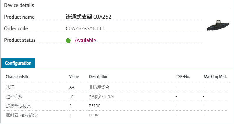 :inline and extractive认证: AA 非防爆场合 过程连接: B1 外螺纹 G1 1/4 接液部分材质: 1 ***PE100 密封圈, 接液部分: 1 EPDM
