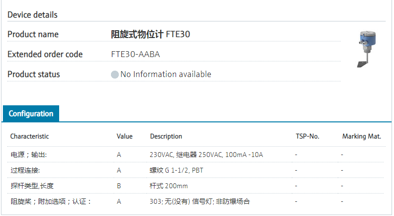 FTE30-AABA 扩展订货号 FTE30-AABA 名称 **阻旋式物位计 FTE30 基本描述 Level limt switch, paddel.