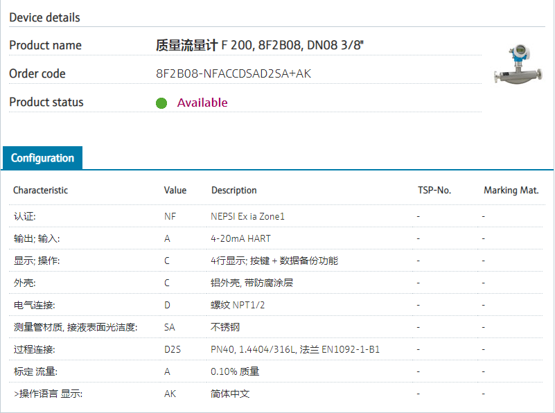 8F2B08-NFACCDSAD2SA+AK 订货号 8F2B08-3HJ3/0 扩展订货号 (8F2B08-NFACCDSAD2SA+AK) 名称 质量流量计 F 200, 8F2B15, DN15 1/2" 认证: NF NEPSI Z1 Ex ia 输出; 输入: A 4-20mA HART 显示; 操作: C 4行显示; 按键 + 数据备份功能 外壳: C 铝外壳, 带防腐涂层 电气连接: D 螺纹 NPT1/2 测量管材质, 接液表面光洁度: SA 不锈钢 过程连接: D2S PN40, 1.4404/316L, 法兰 EN1092-1-B1 标定 流量: A 0.10% 质量 >操作语言 显示: AK 简体中文