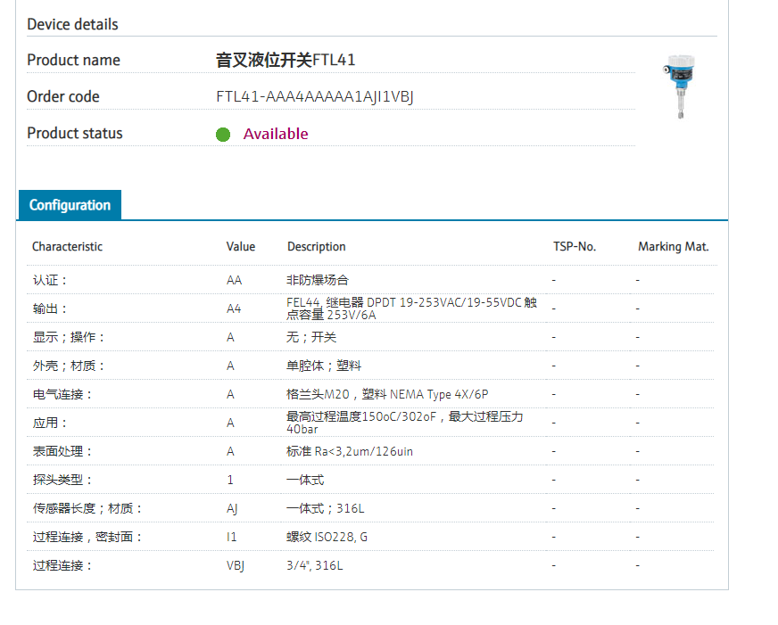 FTL41-AAA4AAAAA1AJI1VBJ 订货号 FTL41-12H3/0 扩展订货号 (FTL41-AAA4AAAAA1AJI1VBJ) 名称 音叉液位开关FTL41 基本描述 Point level, vibronic.