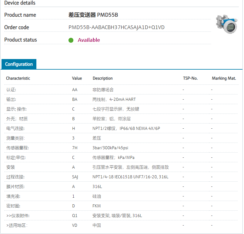 via Bluetooth (optional).认证: AA “推荐”非防爆场合 输出: BA “推荐”两线制,4-20mA HART 显示; 操作: C 七段字符显示屏,无按键 外壳;材质 B “推荐”单腔室;铝,带涂层 电气连接: H “推荐”NPT1/2螺纹,IP66/68 NEMA 4X/6P 测量类别: 3 “推荐”差压 传感器量程: 7H “推荐”3bar/300kPa/45psi 标定;单位: C “推荐”传感器量程;kPa/MPa 安装 A 引压管水平安装,左侧高压端,侧面排放 过程连接: SAJ “推荐”NPT1/4-18 IEC61518 UNF7/16-20, 316L 膜片材质: A “推荐”316L 填充液: 1 “推荐”硅油 密封圈: D “推荐”FKM >>仪表附件: Q1 安装支架, 墙装/管装, 316L >适用地区: VD 中国