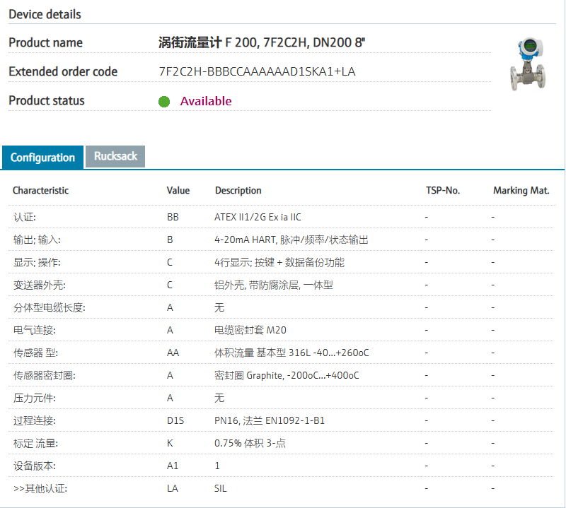 steam and gases.认证: BB ATEX II1/2G Ex ia IIC 输出; 输入: B 4-20mA HART, 脉冲/频率/状态输出 显示; 操作: C 4行显示; 按键 + 数据备份功能 变送器外壳: C 铝外壳, 带防腐涂层, 一体型 分体型电缆长度: A 无 电气连接: A 电缆密封套 M20 传感器 型: AA 体积流量 基本型 316L -40...+260oC 传感器密封圈: A 密封圈 Graphite, -200oC…+400oC 压力元件: A 无 过程连接: D1S PN16, 法兰 EN1092-1-B1 标定 流量: K 0.75% 体积 3-点 设备版本: A1 1 >操作语言 显示: LA SIL