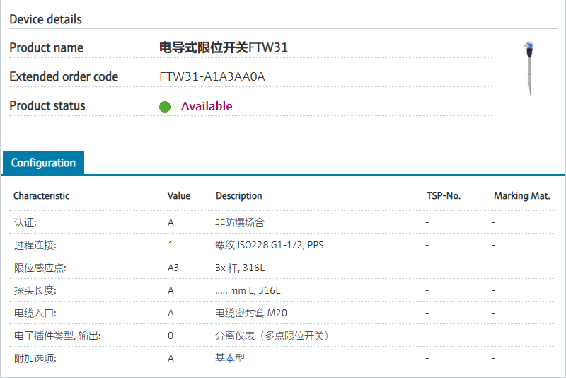 FTW31-A1A3AA0A 扩展订货号 FTW31-A1A3AA0A 名称 电导式限位开关FTW31 基本描述 点式物位仪,电导