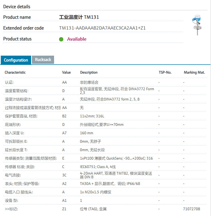 of applications.认证: AA 非防爆场合 温度套管结构: D 配有温度套管, 无延伸段, 符合 DIN43772 Form 2,3 温度计结构设计: A 无延伸段, 符合DIN43772 form 2, 5, 8 过程连接或温度套管连接方式; 材质: AA 无 保护套管直径, 材质: B2 11x2mm; 316L 底端形状: D 外径缩短式,要求U>=70mm) 插入深度 U: A7 160 mm 可拆卸颈长 E: A 0mm, 无脖子 延长段长度 T: A 0mm, 无延长段 传感器类型; 测量范围;铠装材质: E 1xPt100 薄膜式 QuickSens: -50...+200oC; 316 传感器 标准; 类别: C IEC60751; Class A, 4线 电气连接: 3C 4-20mA HART, 双通道 TMT82, 模块温度变送器 DIN B 表头; 材质; 保护等级: A2 TA30A + 显示,翻盖式,铸铝; IP66/68 电缆入口 接线头: A 1x M20x1.5 内螺纹 设备 型: A1 1 >>标记;