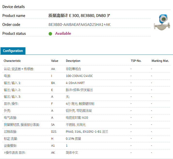 compact, easily accessible transmitter.认证; 变送器 + 传感器: AA 非防爆场合 电源: I 100-230VAC/24VDC 输出; 输入 1: BA 4-20mA HART 输出; 输入 2: E 脉冲/频率/开关输出 输出; 输入 3: A 无; 显示; 操作: F 4行 背光; 光敏按键控制 外壳: A 铝外壳, 带防腐涂层 电气连接: A 电缆密封套 M20 测量管材质, 接液部分表面: SA 不锈钢 过程连接: D2S PN40, 316L, 法兰 EN1092-1-B1 标定 流量: H 0.15% 质量 设备版本: A1 1 >操作语言 显示: AK 简体中文
