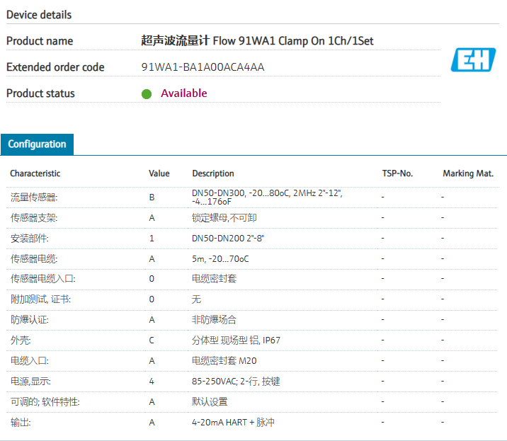 Suitable for hot and cold water流量传感器: B DN50-DN300, -20...80oC, 2MHz 2"-12", -4...176oF 传感器支架: A 锁定螺母,不可卸 安装部件: 1 DN50-DN200 2"-8" 传感器电缆: A 5m, -20...70oC 传感器电缆入口: 0 电缆密封套 附加测试, 证书: 0 无 防爆认证: A 非防爆场合 外壳: C 分体型 现场型 铝, IP67 电缆入口: A 电缆密封套 M20 电源,显示: 4 85-250VAC; 2-行, 按键 可调的; 软件特性: A 默认设置 输出: A 4-20mA HART + 脉冲