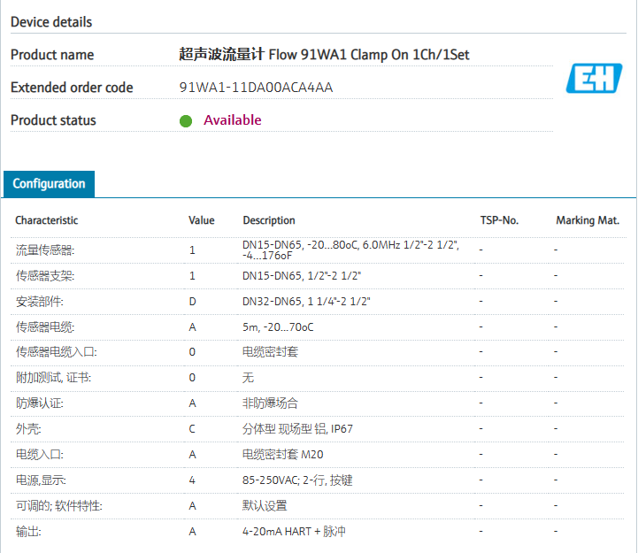 Suitable for hot and cold water流量传感器: 1 DN15-DN65, -20…80oC, 6.0MHz 1/2"-2 1/2", -4…176oF 传感器支架: 1 1DN15-DN65, 1/2"-2 1/2" 安装部件: D DN32-DN65, 1 1/4"-2 1/2" 传感器电缆: A 5m, -20...70oC 传感器电缆入口: 0 电缆密封套 附加测试, 证书: 0 无 防爆认证: A 非防爆场合 外壳: C 分体型 现场型 铝, IP67 电缆入口: A 电缆密封套 M20 电源,显示: 4 85-250VAC; 2-行, 按键 可调的; 软件特性: A 默认设置 输出: A 4-20mA HART + 脉冲