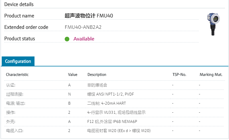 independent of dielectricity/density.认证: A 非防爆场合 过程连接: N 螺纹 ANSI NPT1-1/2, PVDF 电源; 输出: B 二线制; 4-20mA HART 操作: 2 4-行显示 VU331, 现场包络线显示 外壳: A F12 铝,外涂层 IP68 NEMA6P 电缆入口: 2 电缆密封套 M20 (EEx d > 螺纹 M20) 型号参数