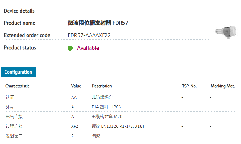 FDR57-AAAAXF22 订货号 FDR57-1035/0 扩展订货号 (FDR57-AAAAXF22) 名称 微波限位栅发射器 FDR57 基本描述 Point level and bulk flow.