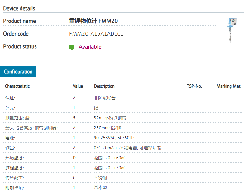 FMM20-A15A1AD1C1 订货号 FMM20-12M0/0 扩展订货号 (FMM20-A15A1AD1C1) 名称 重锤物位计 FMM20 基本描述 Level transmitter, continuous.