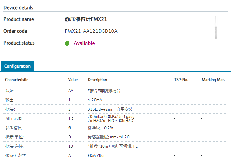 :: Intgerated overvoltage protection.认证: AA *推荐*非防爆场合 输出: 1 4-20mA 探头: 2 316L, d=42mm, 齐平安装 测量范围: 1D 200mbar/20kPa/3psi gauge, 2mH2O/6ftH2O/80inH2O 参考精度: G 标准级, ±0.2% 标定;单位: D 传感器量程; mm/mH2O 探头 连接: 10 *推荐*10m 电缆, 可切短, PE 传感器密封: A FKM Viton