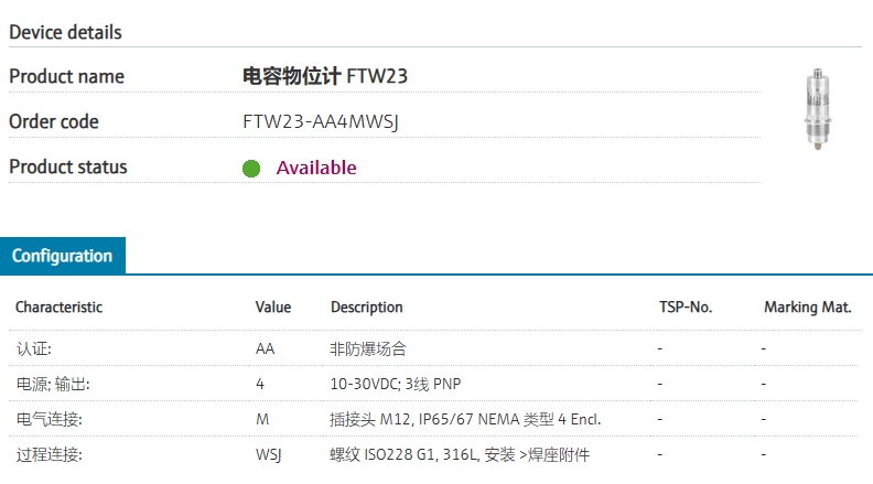 FTC260-AA4D1常用现货,带继电器输出,R1螺纹连接,适用于常温常压,例如储量料仓。
