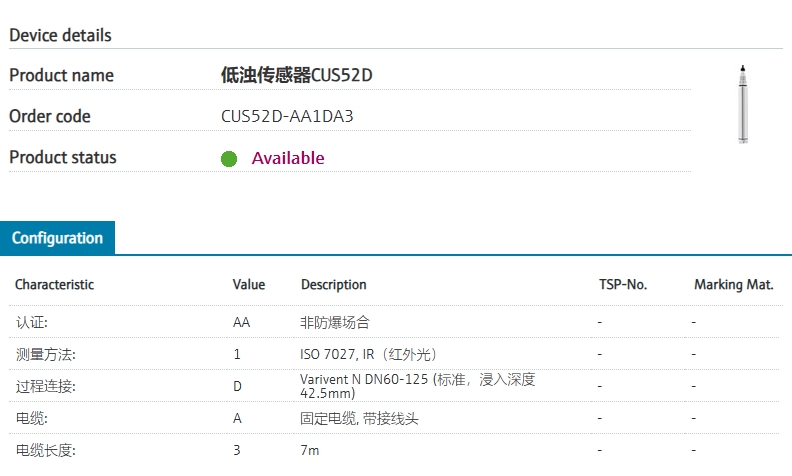 CUS52D-AA1DA3 订货号 CUS52D-2E39/0 扩展订货号 (CUS52D-AA1DA3) 名称 低浊传感器CUS52D 基本描述 Turbdidity sensor according for low