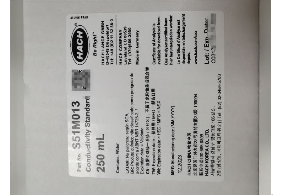 每个标准都有自己的合格证书和可追溯性,可从Hach网站下载。使用经认可的实验室制造的标准可以让您对可追溯链和计算的不确定性充满信心。货号 适用仪器型号 说明 参数 分析方法 包装 量程 S51M013 NACL,25.0μS/cm,AT 25C 电导率 电导率标准-无参数 250mL Concentration 25.0 µS/cm ±5.0 % at 25°C Description Conductivity calibration solution Formula NaCl Method Name Standard solution verified by Reference Materials Laboratory NIST Traceable Yes Package Type Bottle Parameter Conductivity Platform Solution Quantity 250 mL Storage Conditions 10 - 25 °C (protect from light)