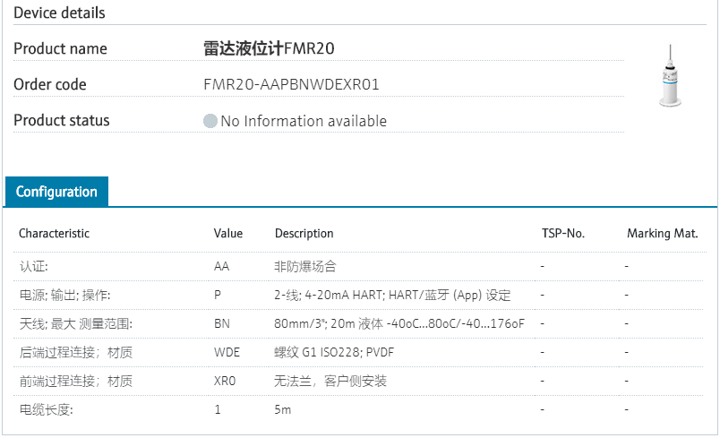 FMR20-AAPBNWDEXR01 订货号 FMR20-10J0/0 扩展订货号 (FMR20-AAPBNWDEXR01) 名称 雷达液位计FMR20 基本描述 Level, radar, contactless