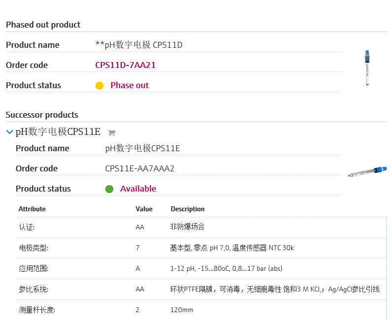 PH电极CPS11D-7AA21是现在市场上用得最多最广泛的电极, 已经进入退市阶段,新款是CPS11E-AA7AAA2|CPS11E-1014/0