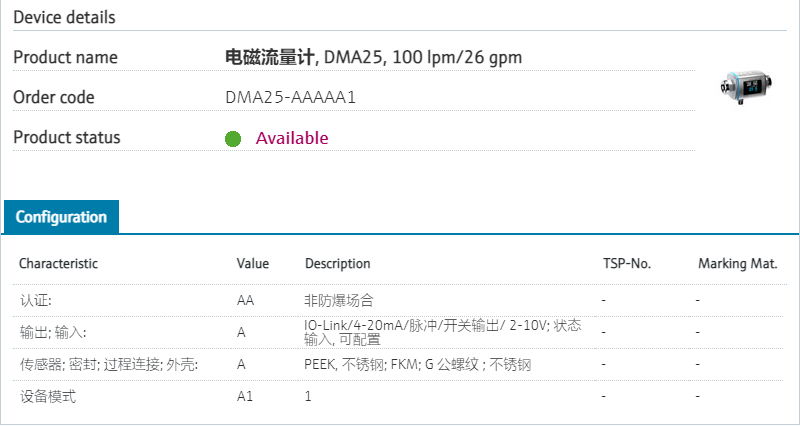 secure Bluetooth connection.防爆认证: AA 非防爆场合 输出; 输入: A IO-Link/4-20mA/脉冲/开关输出/ 2-10V; 状态 输入, 可配置 传感器; 密封; 过程连接; 外壳: A PEEK, 不锈钢; FKM; G 公螺纹 不锈钢 设备模式 A1 1 产品型号