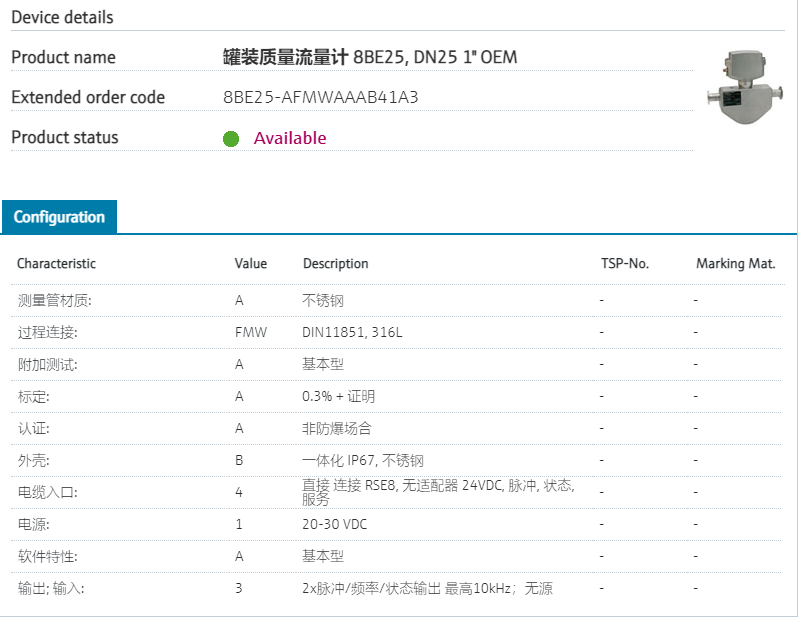 8BE25-AFMWAAAB41A3 扩展订货号 8BE25-AFMWAAAB41A3 名称 质量流量计 Dosimass, 8BE25, DN25 1" 测量管材质: A 不锈钢 过程连接: FMW DIN11851, 316L 附加测试: A 基本型 标定: A 0.3% + 证明 防爆认证: A 非防爆场合 外壳: B 一体化 IP67, 不锈钢 电缆入口: 4 直接 连接 RSE8, 无适配器 24VDC, 脉冲, 状态, 服务 电源: 1 20-30 VDC 软件特性: A 基本型 输出; 输入: 3 2x脉冲/频率/状态输出 最高10kHz;无源 产品型号