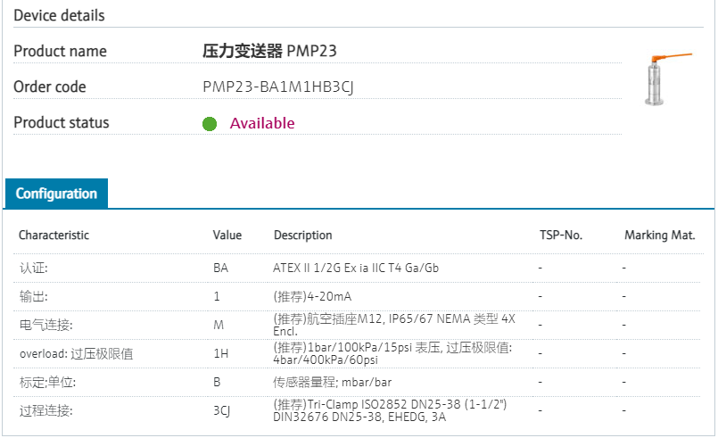 :: 适用于SIP/CIP.认证: BA ATEX II 1/2G Ex ia IIC T4 Ga/Gb 输出: 1 (推荐)4-20mA 电气连接: M (推荐)航空插座M12, IP65/67 NEMA 类型 4X Encl. overload: 过压极限值 1H (推荐)1bar/100kPa/15psi 表压, 过压极限值: 4bar/400kPa/60psi 标定;单位: B 传感器量程; mbar/bar 过程连接: 3CJ (推荐)Tri-Clamp ISO2852 DN25-38 (1-1/2") DIN32676 DN25-38, EHEDG, 3A 型号参数