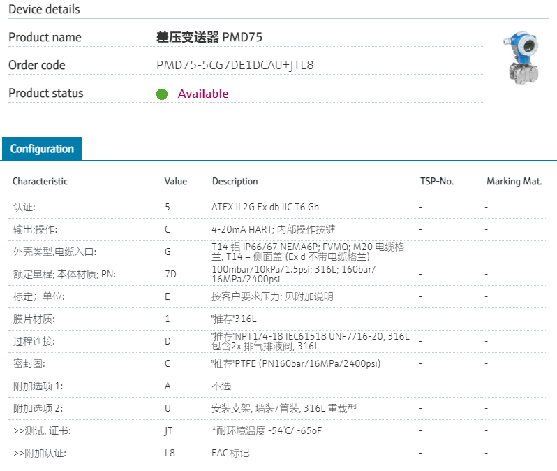 PMD75-5CG7DE1DCAU+JTL8 订货号 PMD75-8DT31/0 扩展订货号 (PMD75-5CG7DE1DCAU+JTL8) 名称 差压变送器 PMD75 基本描述 Measurement: Differential pressure,