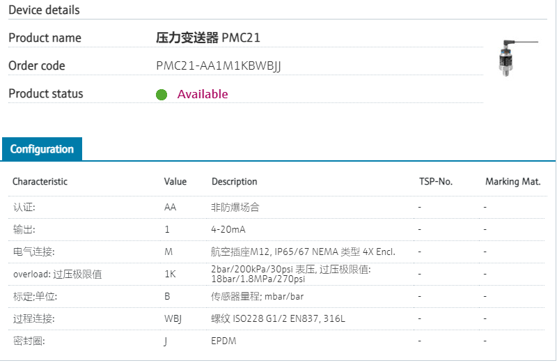 ::长期稳定性高+抗过载能力强认证: AA 非防爆场合 输出: 1 4-20mA 电气连接: M 航空插座M12, IP65/67 NEMA 类型 4X Encl. overload: 过压极限值 1K 2bar/200kPa/30psi 表压, 过压极限值: 18bar/1.8MPa/270psi 标定;单位: B 传感器量程; mbar/bar 过程连接: WBJ 螺纹 ISO228 G1/2 EN837, 316L 密封圈: J EPDM 型号参数