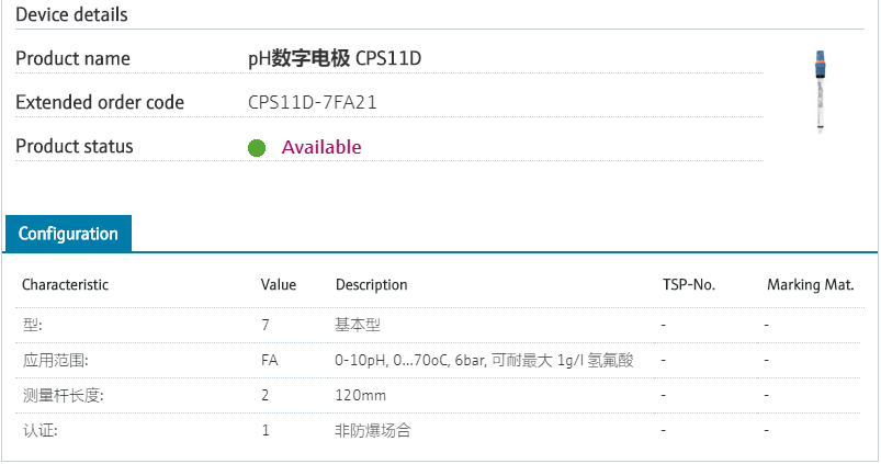 Temeratur sensor integrated.类型: 7 基本型 应用范围: FA 0-10pH, 0...70℃, 6bar, 可耐最大 1g/l 氢氟酸 测量杆长度: 2 120mm 认证: 1 非防爆场合 型号参数