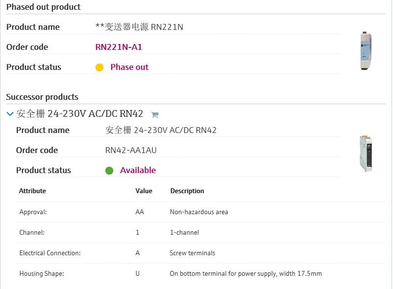 有源隔离栅,用于安全隔离4...20 mA电流信号 RN221N已经停产,新款为RN42-AA1AU