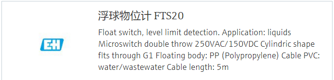 Liquifloat T FTS20 AC/DC PP/PVC, 5m Point level switch, float. Application: liquids. Microswitch double throw 250VAC/150VDC. Cylindric shape fits through G1. Floating body: PP (Polypropylene). Cable: PVC. Cable length: 5m.
