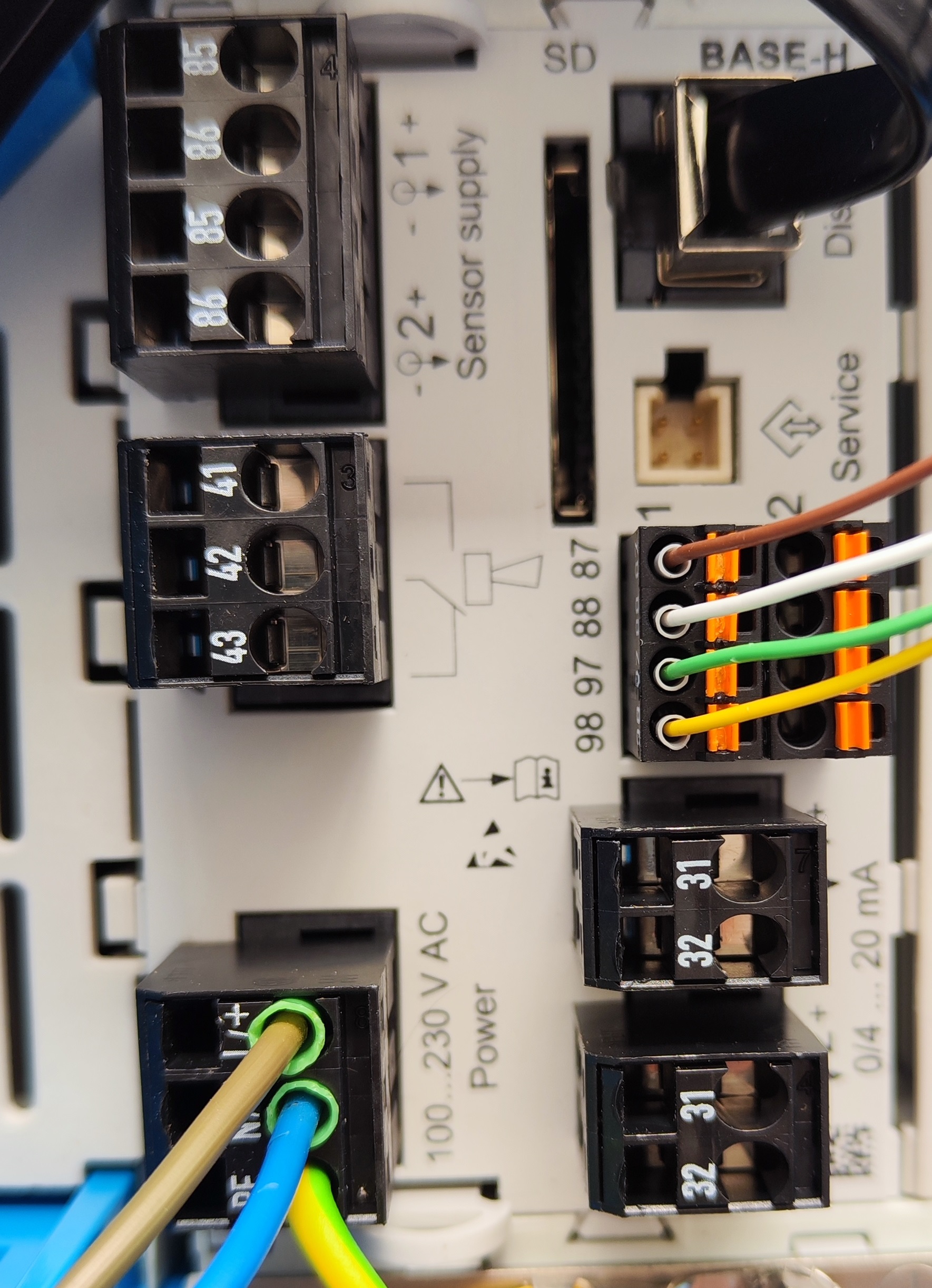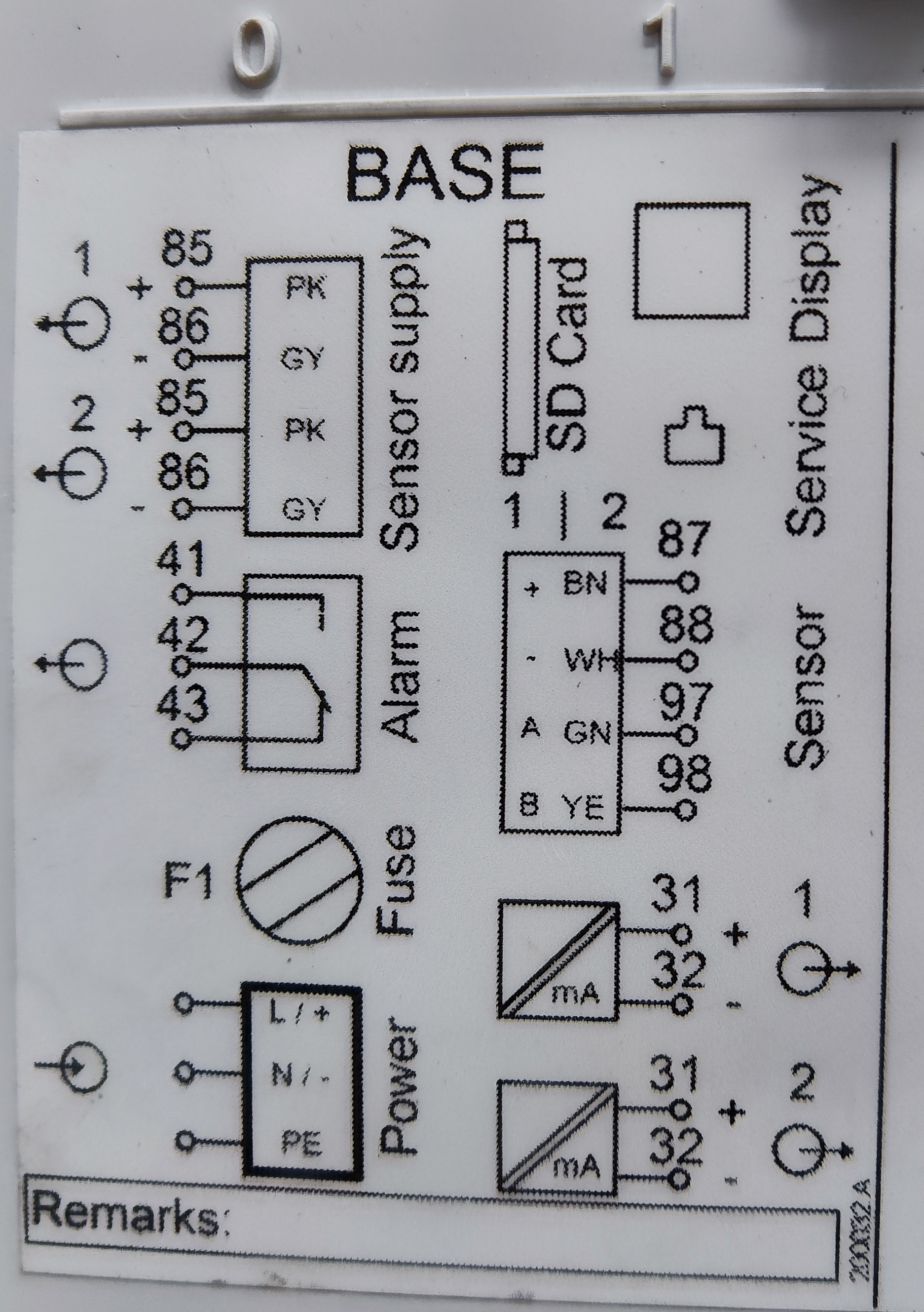 CM442的接线示意图:CM442的主板显示供电为220 V AC,这边我们是使用CPS玻璃电极,数字式传感器,不带附加电源,选用的是CYK10数字电极电缆,接线为87棕色、88白色、97绿色、98黄色。