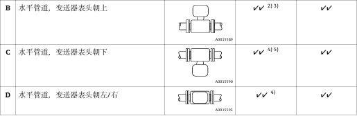 3、电子部件过热危险!如果流体温度超过200 °C (392 °F),公称口径DN 100 (4")和DN 150 (6")的夹持式 仪表(Prowirl D)禁止采用安装方向B。测量高温介质时(例如蒸汽或流体温度(TM)超过200 °C (392 °F)):选择安装方向C或D。 测量低温介质时(例如液氮):选择安装方向B或D。 带“湿蒸汽检测/测量”选项的仪表型号:选择安装方向C。
