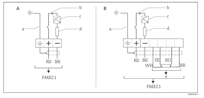 A 仪表 B 仪表 + Pt100(非防爆区)a 不适用外径29 mm (1.14 in)的仪表 b 10.5 … 30 VDC(防爆区)、10.5 … 35 VDC c 4 … 20 mA d电阻(RL)e Pt100