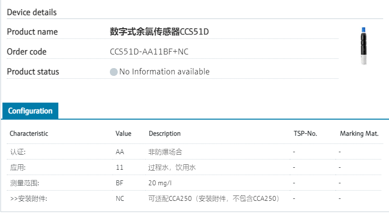 process control, flexible installation认证: AA 非防爆场合 应用: 11 过程水,饮用水 测量范围: BF 20 mg/l >>安装附件: NC 可适配CCA250(安装附件,不包含CCA250) >>标记: Z1 位号 (TAG), 见附加说明 型号参数