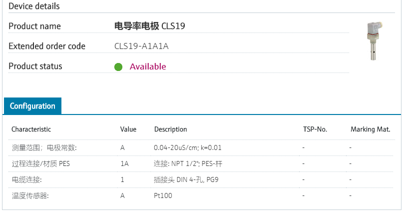 Material: 316Ti, PES.测量范围;电极常数: A 0.04-20uS/cm; k=0.01 过程连接/材质 PES 1A 连接: NPT 1/2"; PES-杆 电缆连接: 1 插接头 DIN 4-孔, PG9 温度传感器: A Pt100 型号参数