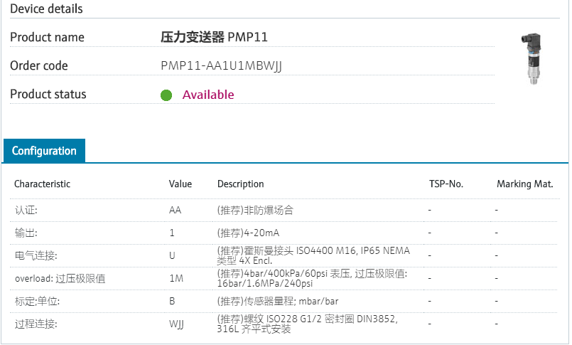 PMP11-AA1U1MBWJJ 订货号 PMP11-1DN8/0 扩展订货号 (PMP11-AA1U1MBWJJ) 名称 压力变送器 PMP11 基本描述 压力, 压阻式