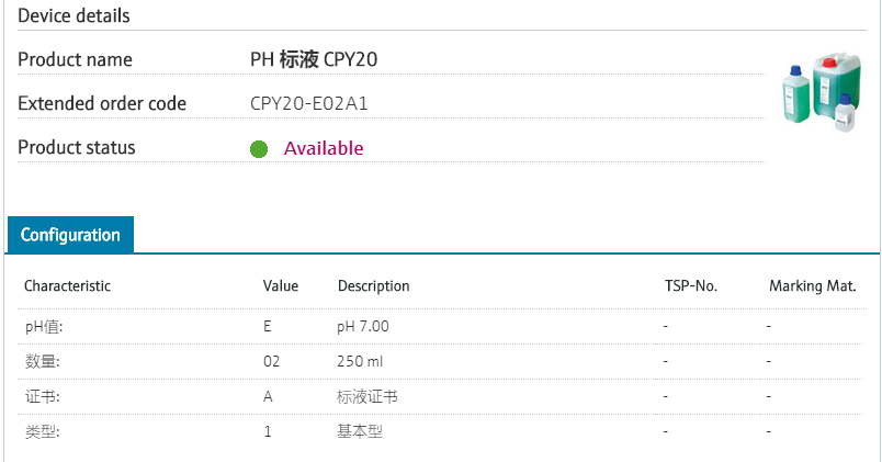 CPY20-E02A1 扩展订货号 CPY20-E02A1 名称 PH 标液 CPY20 基本描述 pH quality buffer solution, referenced
