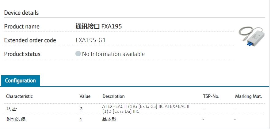 FXA195-G1 扩展订货号 FXA195-G1 名称 通讯接口 FXA195 基本描述 Modem to connect HART field devices