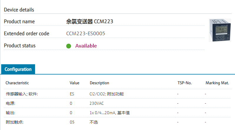 CCM223-ES0005 扩展订货号 CCM223-ES0005 名称 余氯变送器 CCM223 基本描述 Transmitter, chlorine/chlorine dioxide.