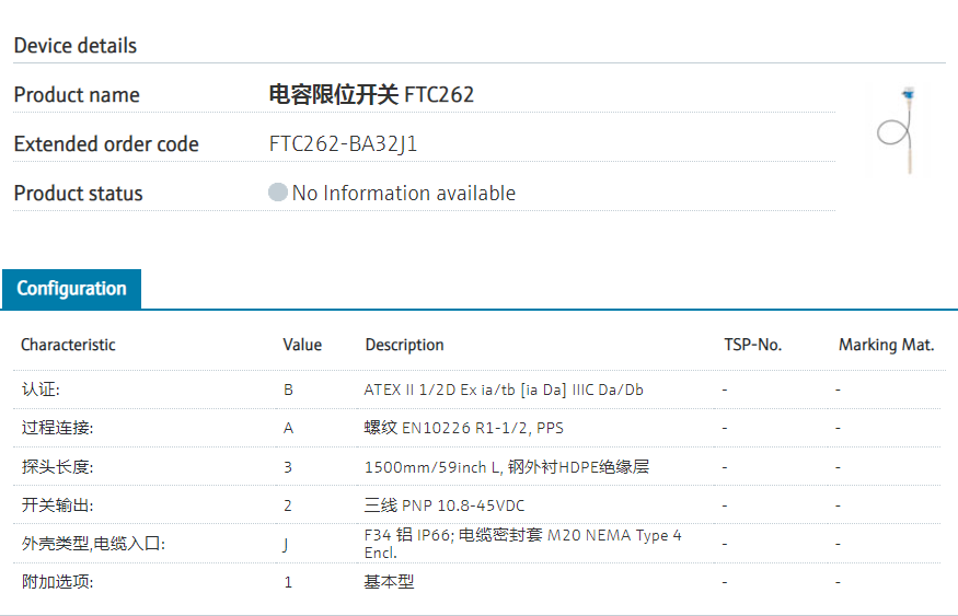 :: 缆绳长度可简易截短认证: B 仅用于国外ATEX II 1/2D Ex ia/tb [ia Da] IIIC Da/Db 过程连接: A 螺纹 EN10226 R1-1/2, PPS 探头长度: 3 1500mm/59inch L, 钢外衬HDPE绝缘层 开关输出: 2 三线 PNP 10.8-45VDC 外壳类型,电缆入口: J F34 铝 IP66; 电缆密封套 M20 NEMA Type 4 Encl. 附加选项: 1 基本型