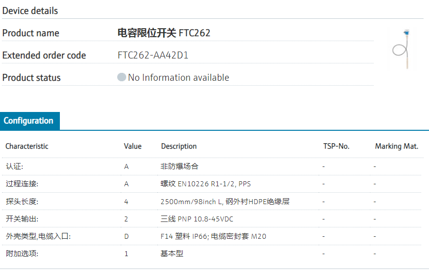 :: 缆绳长度可简易截短认证: A 非防爆场合 过程连接: A 螺纹 EN10226 R1-1/2, PPS 探头长度: 4 2500mm/98inch L, 钢外衬HDPE绝缘层 开关输出: 2 三线 PNP 10.8-45VDC 外壳类型,电缆入口: D F14 塑料 IP66; 电缆密封套 M20 附加选项: 1 基本型