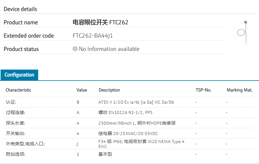 FTC262-BA44J1 扩展订货号 FTC262-BA44J1 名称 电容限位开关 FTC262 基本描述 点式物位传感器, 电容