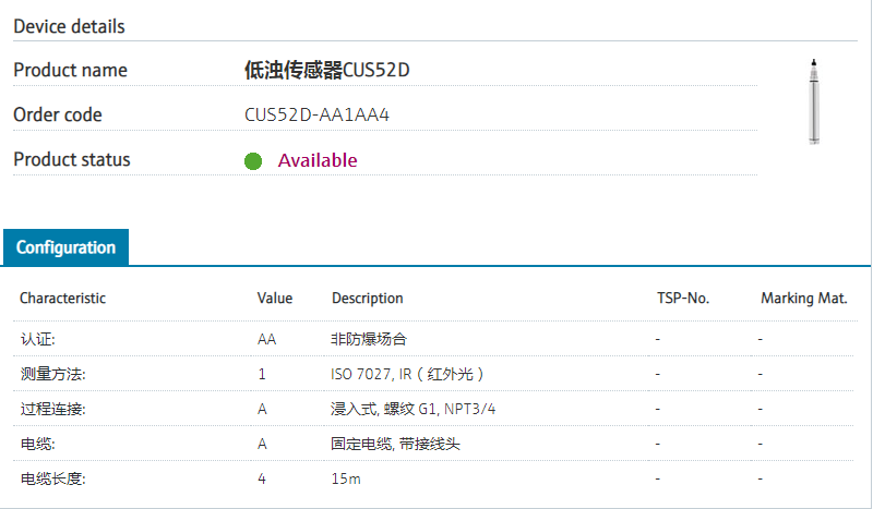 CUS52D-AA1AA4 订货号 CUS52D-11P7/0 扩展订货号 (CUS52D-AA1AA4 ) 名称 低浊传感器CUS52D 基本描述 Turbdidity sensor according for low