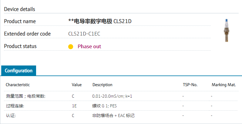 Materials: PES; titanium; graphite测量范围;电极常数: C 0.01-20.0mS/cm; k=1 过程连接: 1E 螺纹 G 1; PES 认证: C 非防爆场合 + EAC 标记