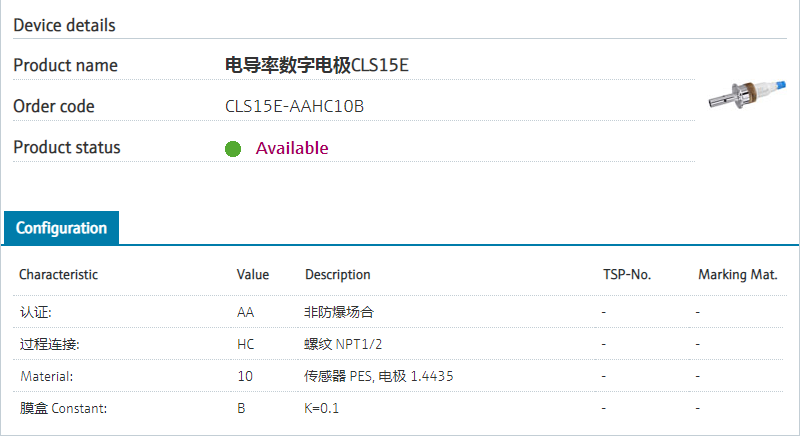 CLS15E-AAHC10B 电导率传感器适用于纯水和超纯水的标准测量场合 非防爆场合 连接; 螺纹NPT1 / 2 传感器 PES. 电极 1.4435 膜盒 Constant: K=0.01